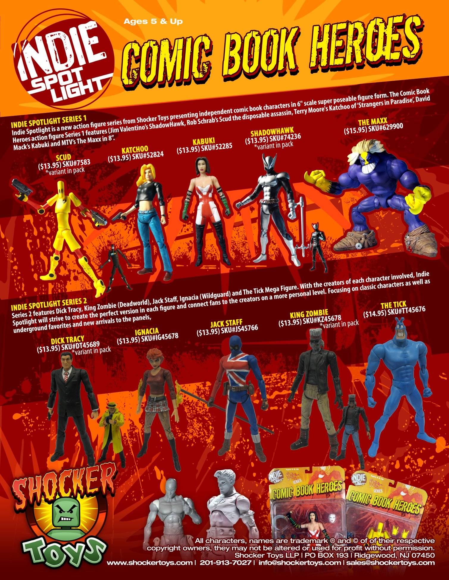 Indie Spotlight Comic Book Heroes, which was released in 2009 and hit mass retail in 2010, is an ever-growing comic book universe action figure series from Shocker Toys. Presenting independent comic book characters in hyper-posable 6” scale for collectors to fit in with their other favorite lines, the line features collector friendly packaging and accessories.