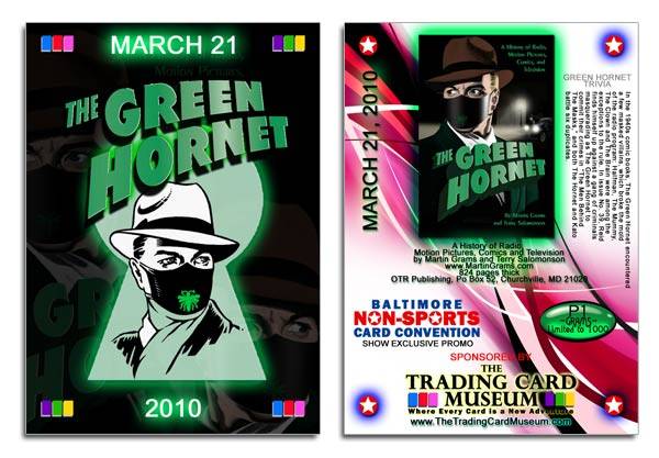 HERSHEY, PA – USA Theatres, organizers of the up-coming Baltimore Non-Sports Card Convention, recently revealed a limited edition Green Hornet promo card, designed exclusively for the convention, in conjunction with Martin Grams’ and Terry Salomonsons’ up-coming Green Hornet book due for publication March 2010.