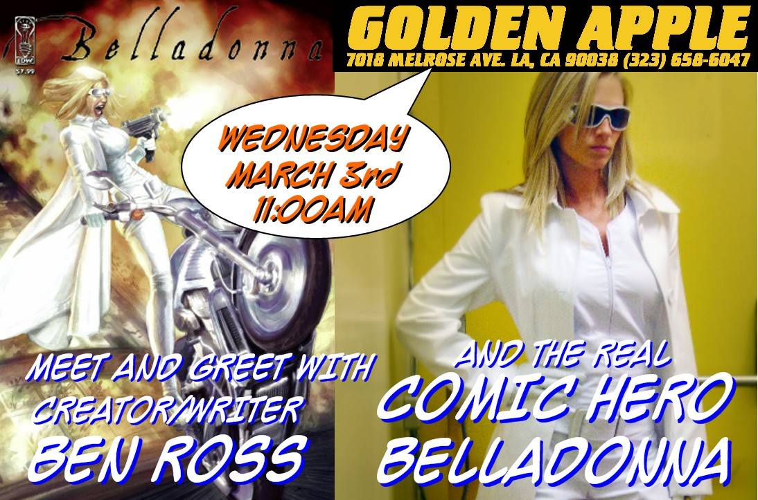 Home Category Comic Books CA – Belladonna Signing CategoryComic BooksDirectorySigning and Appearance ProfilesUnited StatesCalifornia CA – Belladonna Signing By Colin Solan - February 26, 2010 111 0 FacebookTwitterPinterestWhatsApp Ben Ross and Belladonna sign at Golden Apple Comics on March 3rd at 11am. Golden Apple Comics, 7018 Melrose Ave, Los Angeles, CA 90038 (323) 658-6047