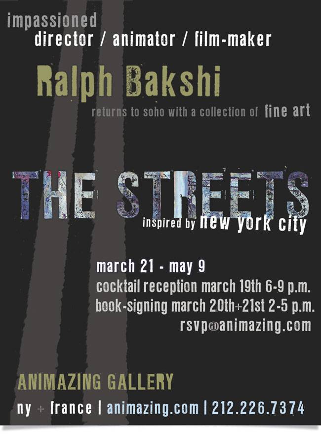 Ralph Bakshi will return to Animazing Gallery in SoHo for a reception where his altogether new series of fine art paintings will be debuted in an exhibition entitled The Streets. This bold series of mixed-media construction/paintings was inspired by the gritty and colorful neighborhoods of Bakshi’s youth in lower Manhattan and Brooklyn.