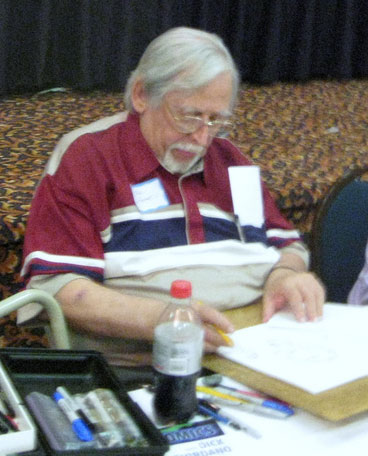 Here is a photo taken by my brother Michael showing how we’ll remember him, at conventions visiting with and producing great art for fans: