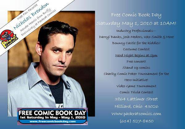 Nicholas Brendon of Joss Whedon’s Buffy the Vampire Slayer makes a special guest appearance at Packrat Comics for Free Comic Book Day. An Exclusive Xander Action Figure is available in limited supply and a free Buffy comic for the first 100 people in line. Free Concert with stand up comedians to follow during annual Nerd Night. Check out the website to stay informed of all the upcoming events at Packrat Comics!