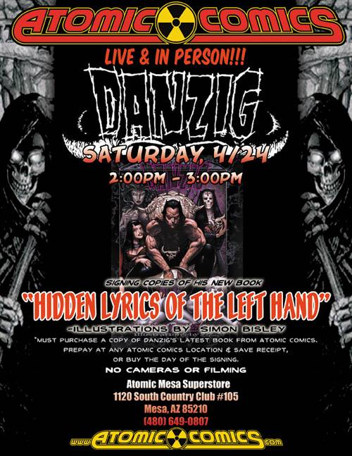 Home Category Comic Books AZ – Danzig Signing CategoryComic BooksDirectorySigning and Appearance ProfilesUnited StatesArizonaHorrorOther AZ – Danzig Signing By Colin Solan - April 16, 2010 131 1 FacebookTwitterPinterestWhatsApp Glen Danzig signs at Atomic Comics on April 24th from 2-3pm. Atomic Mesa, 1120 South Country Club #105, Mesa, AZ 85210