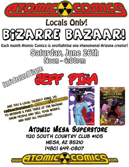 Home Category Comic Books AZ – Bizarre Bazaar CategoryComic BooksDirectorySigning and Appearance ProfilesUnited StatesArizona AZ – Bizarre Bazaar By Colin Solan - May 29, 2010 139 0 FacebookTwitterPinterestWhatsApp Jeff Pina signs at Atomic Comics on Saturday June 26th from noon-4pm. Atomic Comics Mesa Superstore 1120 South Country Club #105, Mesa, AZ 85210