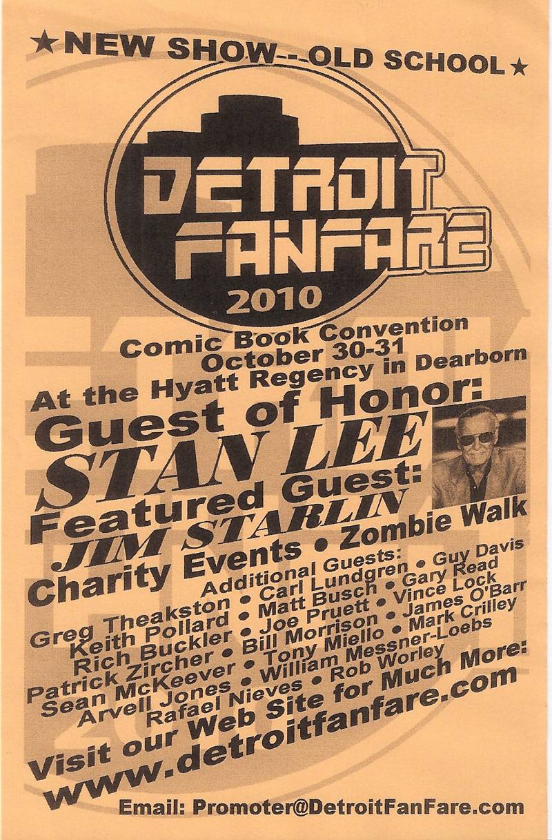 | About This Convention: | Detroit has a very strong connection with comic conventions and fandom. Some of the earliest fandom magazines came out of the Detroit area in the late 1960’s and the Detroit Triple Fan Fair was the first convention of its kind. The “triple” stood for movies, comics, and science fiction. Detroit Fanfare is both proud and excited to bring back home some of the major participants that helped to grow the comic industry into the behemoth it is today. There will panels and discussions where the people who started so much will have a chance to discuss the early days, and reflect on their memories of the great stars that attended the convention. They will provide rare pictures and original drawings of some of the masters of the medium. There will also be a Zombie Walk – “Pre-Show” the Morning of October 30th , and a Blood 4 Comics – October 30th & 31st for the American Red Cross Detroit Chapter plus many other exciting events for the Comic Book lover in you. Be sure to go to www.detroitfanfare.com for the most up to date information Regarding Detroit’s Hottest Comic Book show. |