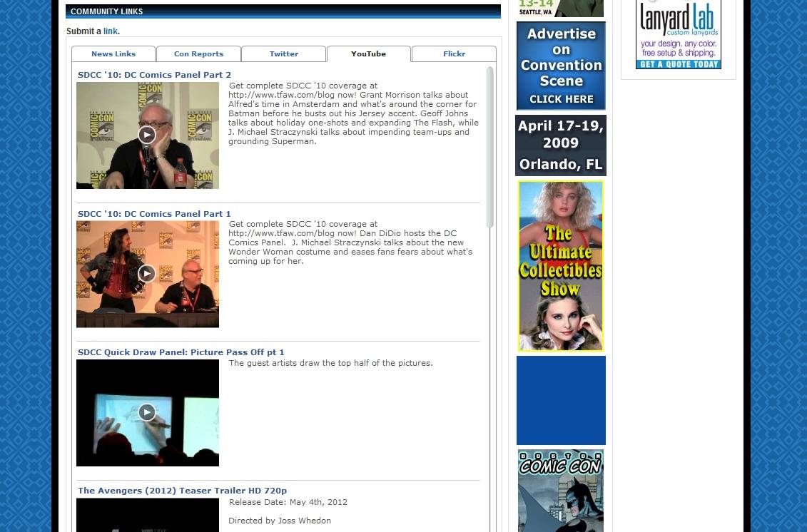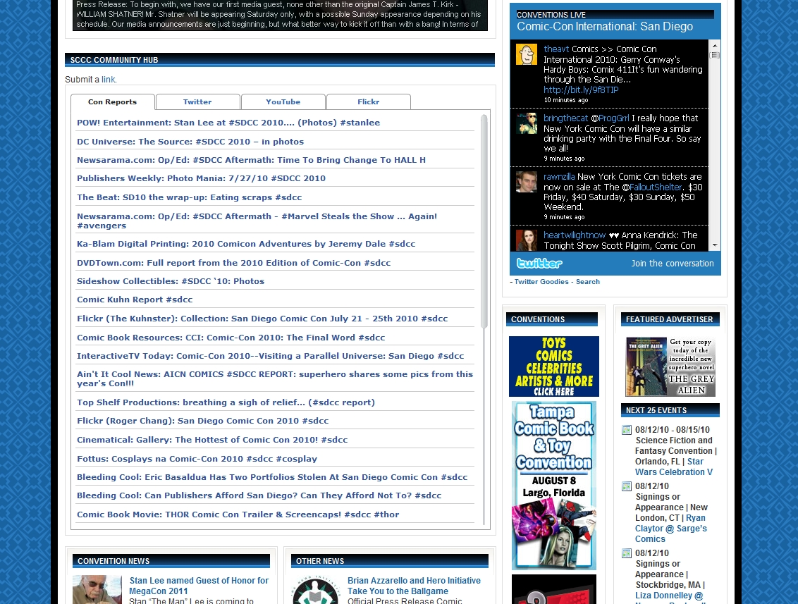 We’re always trying new things to make Convention Scene the best it can be. Some recent examples of that is the SDCC Community Hub that appeared at the top of our site as well as the Community Links section that can be found toward the bottom. Both of these allow us to get content onto the site easily and quickly plus all of the convention news, con reports, and YouTube videos we post appear in our Twitter stream and on our Facebook Fan Page. Plus, there’s a submission page where you can easily submit links to us.