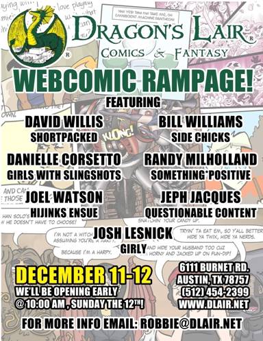 Webcomics Rampage is Dragon’s Lair Comics & Fantasy® Austin’s annual celebration of Webcomics! We invite as many awesome webcomic creators as we can fit into the store and let them loose to chat with fans!