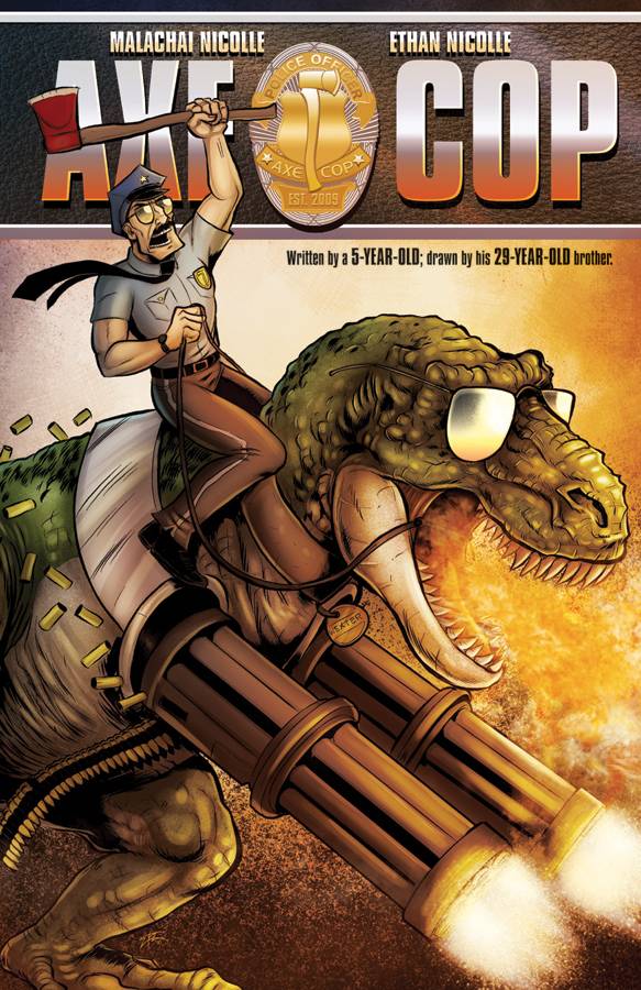 In case you’re new to the Internet, Axe Cop is a webcomic that became wildly popular over this past year for being awesome, and also because of the unique creative team; Axe Cop writer Malachai Nicolle was 5 when the series began and artist Ethan Nicolle, his older brother, was 29. The combination of the two’s different talents have taken the world by storm!