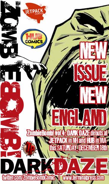 Two of New England’s finest comic shops, Hub Comics in Somerville, MA and Jetpack Comics in Rochester, NH host signings this weekend as ZombieBomb! Dark Daze debuts from Terminal Press.