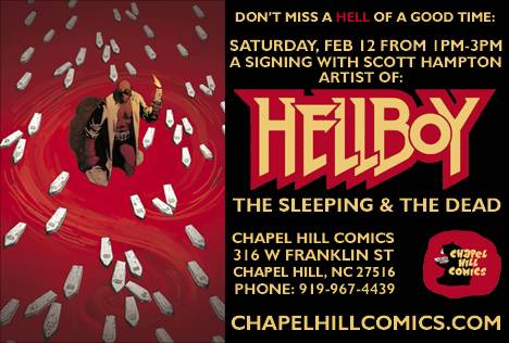 Chapel Hill Comics is proud to announce a signing event featuring local artist Scott Hampton, the artist of the new two-issue Hellboy series, Hellboy: The Sleeping and the Dead, published by Dark Horse Comics. We will have stock on hand of both issues of the series, including separate covers of issue #1 by Scott Hampton and series creator Mike Mignola.