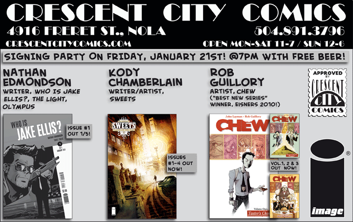 Friday January 21, 2011 Crescent City Comics hosts a signing party with writer NATHAN EDMONDSON (Who is Jake Ellis?), artist/writer KODY CHAMBERLAIN (Sweets) and artist ROB GUILLORY (Chew)–it’ll run from 7-10pm, with FREE beer, sales on select items and more!