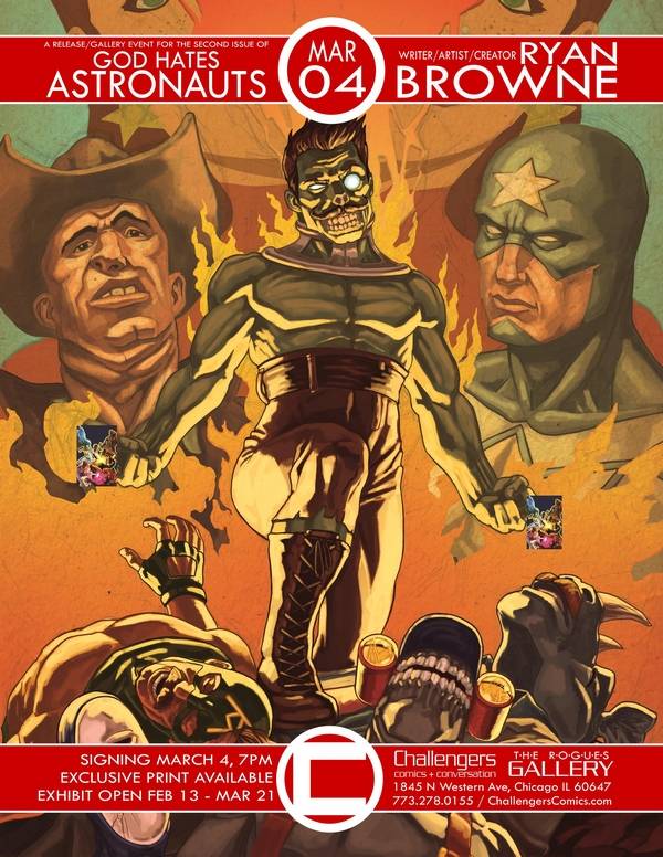 Home Category Comic Books IL – God Hates Astronauts Signing CategoryComic BooksArt ShowDirectorySigning and Appearance ProfilesUnited StatesIllinois IL – God Hates Astronauts Signing By Colin Solan - February 5, 2011 144 0 FacebookTwitterPinterestWhatsApp Ryan Brown signs on March 4, 2011 at 7pm. Challengers Comics 1845 N. Western Ave. 2R, Chicago, ILĀ 60647