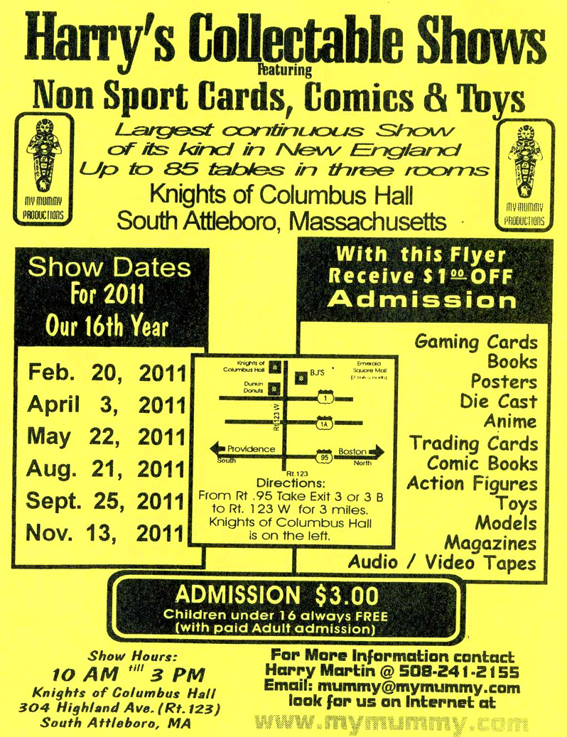 Our 118th South Attleboro Comic, Toy, & Non-Sport Card Show begins at 10:00am and is over at 3:00pm. Admission is $3.00 with kids free with paid adult. See 30 plus vendors on 60 tables with treasures you won’t find elsewhere, Gaming cards, Books, posters, Die Cast, Ation Figures, Toys, Models, Magazines, CD’s and DVD’s. |