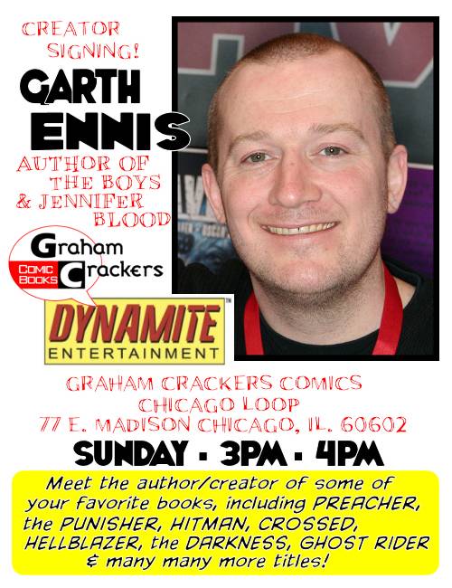 Home Category Comic Books IL – The Boys Signing CategoryComic BooksDirectorySigning and Appearance ProfilesUnited StatesIllinois IL – The Boys Signing By Colin Solan - March 17, 2011 117 0 FacebookTwitterPinterestWhatsApp Garth Ennis signs on Sunday March 20th from 3-4pm. Graham Crackers Comics 77 E. Madison St., Chicago, IL 60602