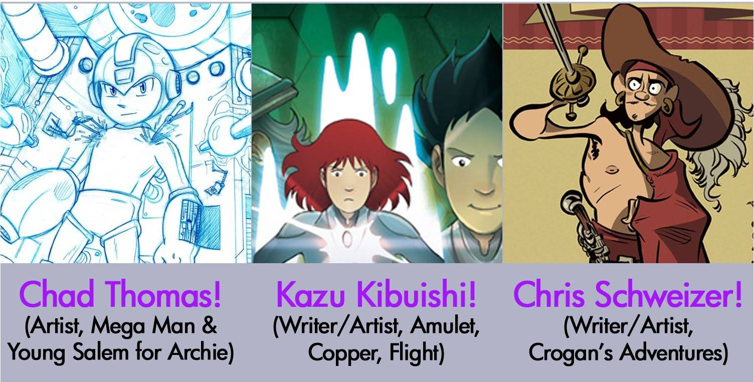 Join us for our all-ages awesomeness event, featuring guests Chad Thomas (Mega Man, Young Salem), Kazu Kibuishi (Amulet, Copper, Flight) and Chris Schweizer (Crogan’s Adventures)!
