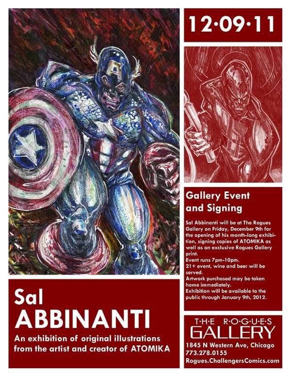 “Atomika” creator Sal Abbinanti exhibits more than sixty works of comics art at Challengers’ Rogues Gallery. The opening is a 21+ event and includes free beer, wine, and a signing; the exhibition runs through January 9. Artwork purchased at the gallery can be taken home immediately. Enjoy!