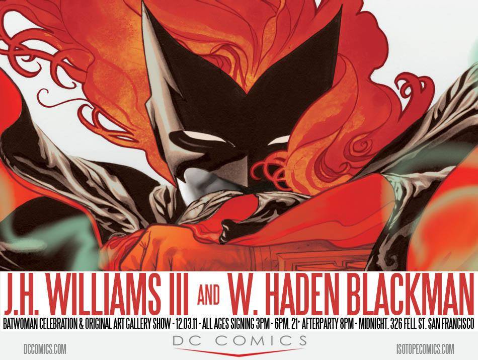 December brings an entire month-long celebration of the most gorgeous comic being produced today, BATWOMAN, at the Isotope! With a gallery of JH Williams III’s original artwork from issue #3 on display, and two amazing creator in-store events that will rock your world!