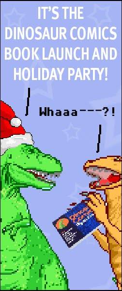 We’re launching the book just a few days before a big holiday, and we figured “We can totally make this a party that EVERYONE can enjoy!!!” It’s also THE OFFICIAL DINOSAUR COMICS HOLIDAY PARTY! (woooo!) Food, drinks, and merriment! Wear your Santa hats! Bring a Secret Santa gift and you’ll receive one (details below)! Even more: December 19th is “Feel Free To Say Hi If I’m Wearing A Dinosaur Comics Shirt Day, Woooooo!” So wear your Dinosaur Comics shirt to spark a conversation! Or spot somebody wearing one and ask thon about it. Or feel free to observe the day silently — the holidays are for everyone!