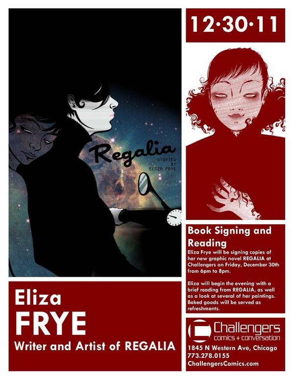 Eliza will begin the evening with a brief reading from her new graphic novel REGALIA, as well as a look at several of her paintings. Baked goods will be served as refreshments.