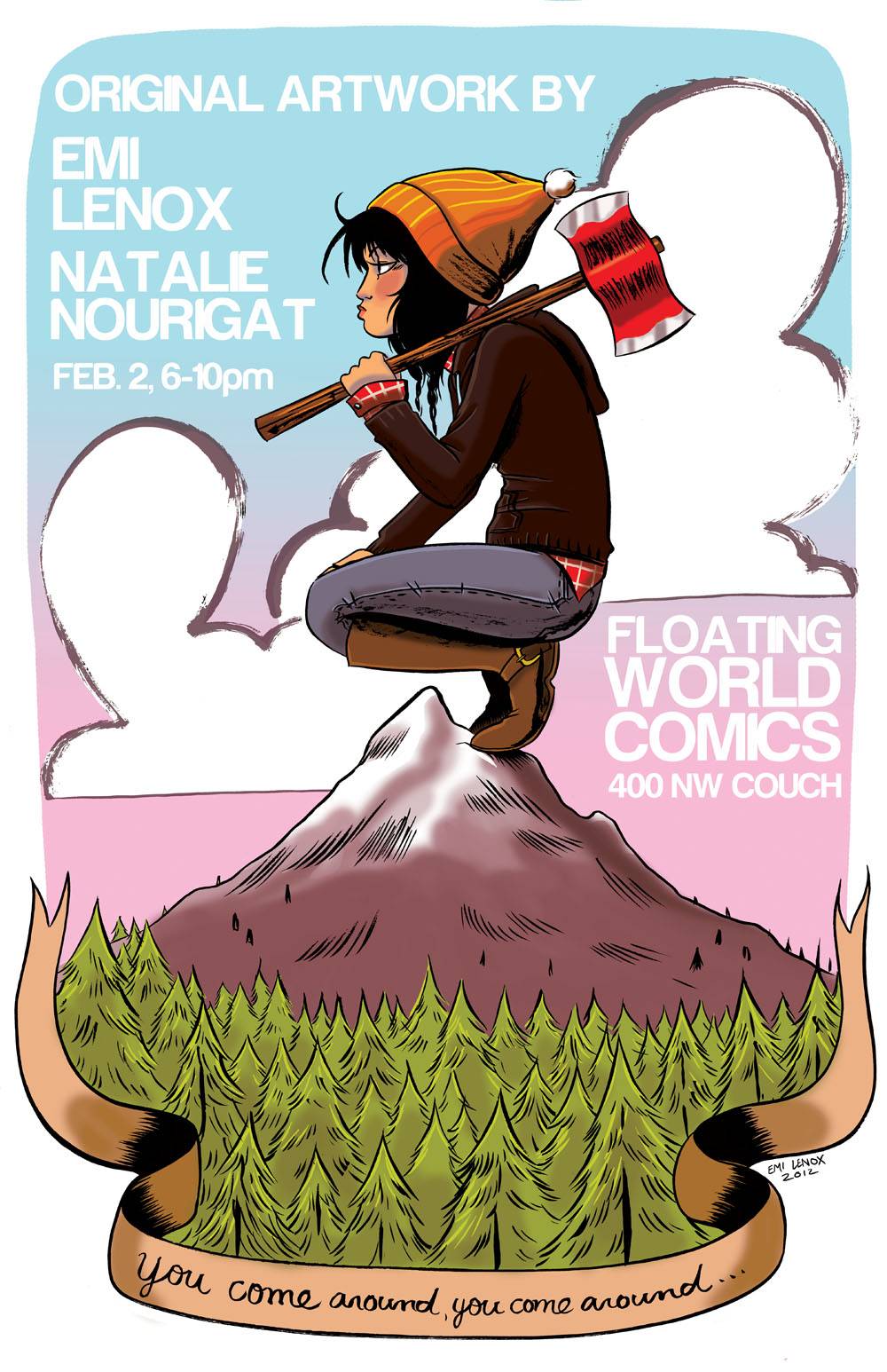 Emi Lenox and Natalie Nourigat open an Art exhibit and print release at Floating World Comics on Thursday February 2nd, 2012 from 6-10pm. Each artist will display pages from their two new books EmiTown vol.2 and Between Gears, which will both be released by Image Comics.