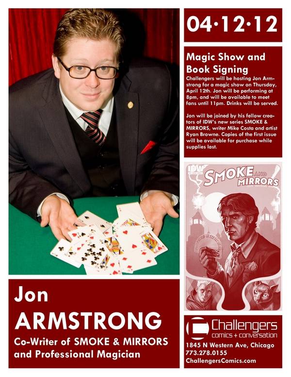Jon will be joined by his fellow creators of IDW’s new series SMOKE & MIRRORS, writer Mike Costa and artist Ryan Browne. Copies of the first issue will be available for purchase while supplies last.