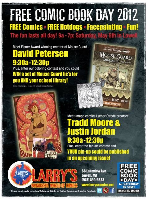 David Petersen, Tradd Moore, and Justin Jordan sign at Larry’s Comics on Saturday May 5th from 9:30am – 12:30pm for Free Comic Book Day! Larry is hosting a coloring contest for kids to win a set of Mouse Guard HCs and one aspiring artist will be picked to have their Luther Strode pinup appear in an upcoming issue! Plus facepainting, free hotdogs with Larry’s secret sauce, and of course FREE COMICS!