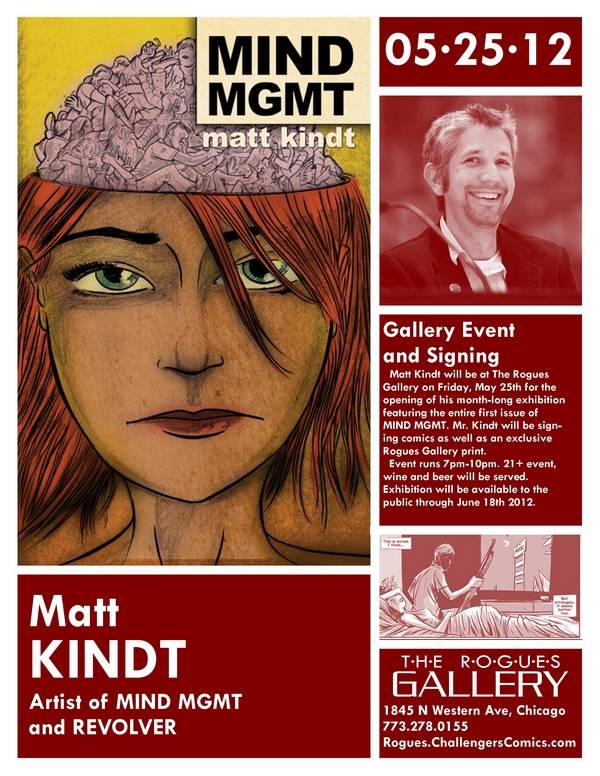 Matt Kindt appears at The Rogues Gallery on Friday, May 25th for the opening of his month-long exhibition featuring the entire first issue of MIND MGMT. Mr. Kindt will be signing comics as well as an exclusive Rogues Gallery print.