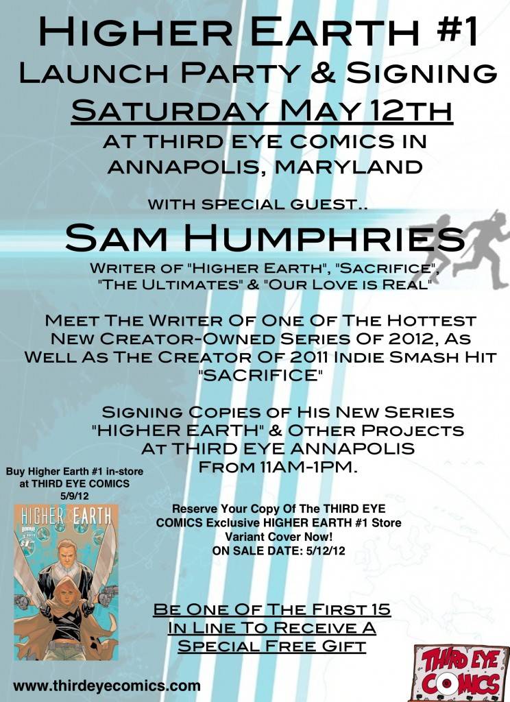 HIGHER EARTH #1 releases in-store on Wednesday 5/9/12, and Sam Humphries (writer of SACRIFICE, ULTIMATES, OUR LOVE IS REAL) will be in-store on Saturday 5/12/12.
