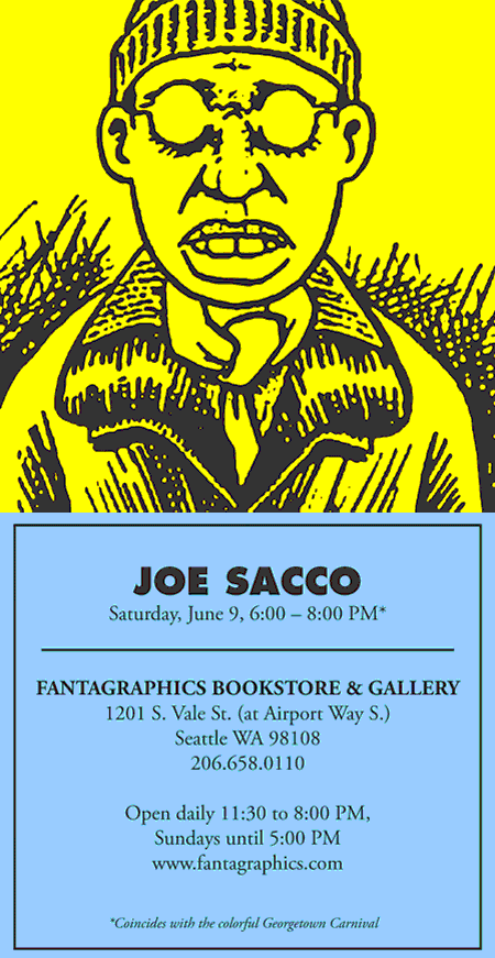 Joe Sacco appears at the Fantagraphics Bookstore & Gallery on Saturday, June 9, 2012, from 6:00 to 8:00 PM, to celebrate his new book Journalism. Visitors to this signing will be among the first in the nation to see the book, which will be officially released 10 days later. Don’t miss this opportunity to meet this extraordinary artist and pick up an advance copy of the book.