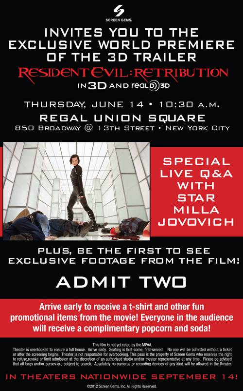 Forbidden Planet NYC and Regal Entertainment Group invite you to experience the Exclusive World Premiere of the 3D Trailer for: Resident Evil: Retribution at the Regal Union Square (850 Broadway at 13th Street, NYC) with a Special Live Q & A with star Milla Jovovich!