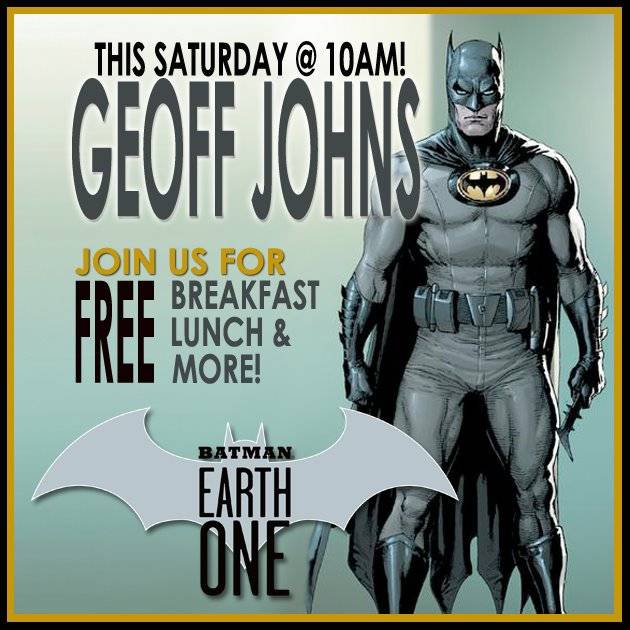 Writer Geoff Johns signs at CornerStoreComics in Anaheim on Saturday, August 4, 2012 from 10:00am – 12:00pm. They’ll be set up early with FREE coffee and donuts to make the wait more comfortable, and then bring in FREE pizza and sodas for lunch around 11:30am too!