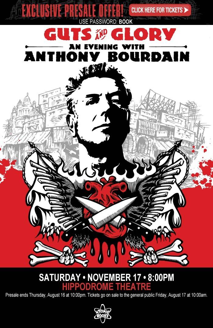 Anthony Bourdain brings his Guts & Glory tour to Baltimore this fall. The internationally renowned chef, author, and television host will visit the Hippodrome Theatre for one night only, Saturday, November 17 at 8:00pm. Bourdain will spend the evening sharing candid, often hysterical insights about his life’s work and travels, including an open question and answer session with the audience.