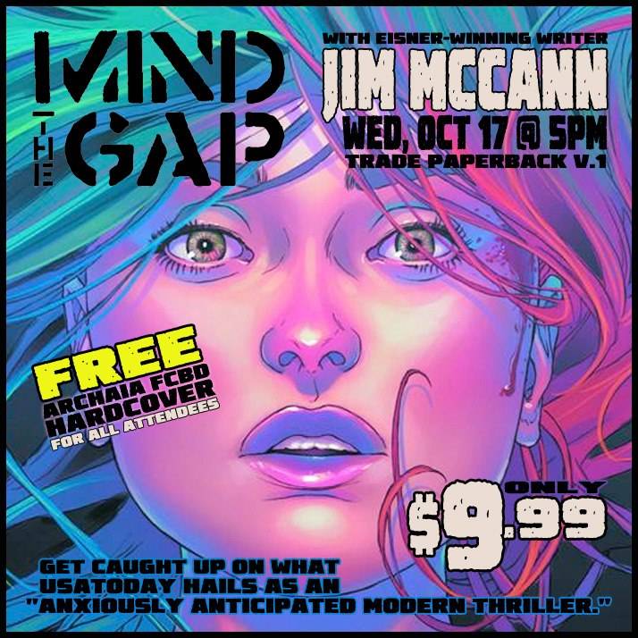 Eisner-winning writer Jim McCann returns to Beach Ball Comics on Wednesday, October 17, 2012 from 5:00pm until 7:00pm for the release of Mind the Gap Volume 1, the first five issues of the great Image series collected into one trade paperback! The book is priced at only $9.99, and comes out in time to get you caught up before the next arc starts in issue #6 in a few weeks! We’ve also got FREE copies of the highly-collectible FCBD Archaia Hardcover, which includes a new chapter of Jim’s Dapper Men (with Janet Lee), for ALL attendees — while supplies last!