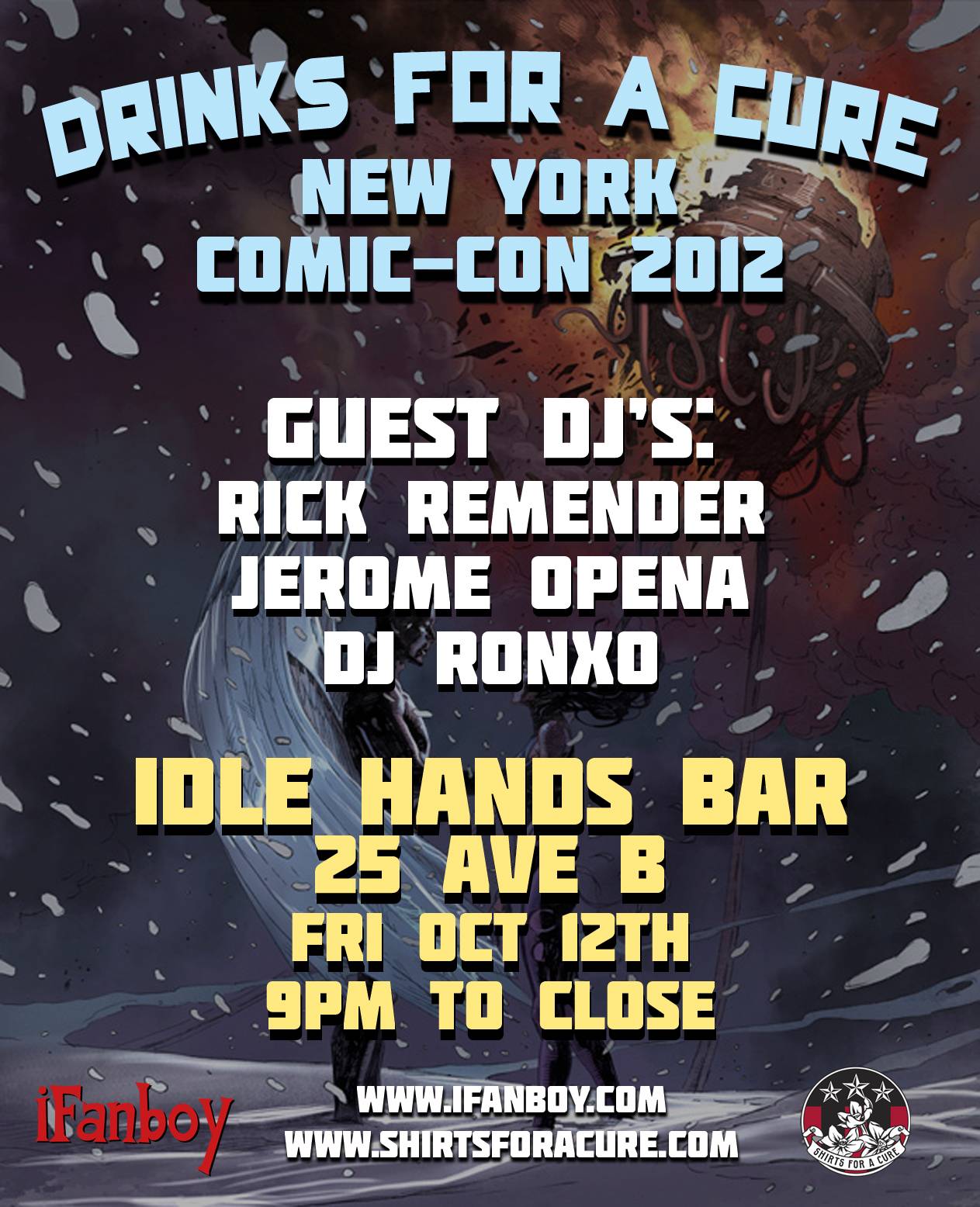 iFanboy teams up again with our friends at Shirts for a Cure to throw an awesome party on Friday, October 12th from 9:00 PM till close and help in the fight against breast cancer. Comic book superstars Rick Remender (Uncanny X-Force, Fear Agent, Uncanny Avengers) and Jerome Opeña (Uncanny X-Force, Fear Agent, Avengers) will step up to the turntables to DJ the party. You can also look forward to iFanboy’s very own Ron Richards (DJ Ronxo) taking a turn behind the virtual turntables. Proceeds from drinks will go charity to help fight breast cancer! Come early because last year’s party was so packed that some people had to move to a second, spill-over bar. This has got the makings of yet another epic iFanboy party that you don’t want to miss!