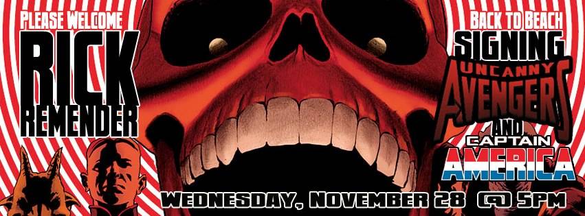 RICK REMENDER returns to Beach Ball Comics on Wednesday, November 28th at 5:00pm, this time to celebrate not one, but TWO new comics in the MARVEL NOW arsenal! The second issue of Rick’s UNCANNY AVENGERS comes out that day, plus the first issue of the brand new CAPTAIN AMERICA comes out the week before! BRING ‘EM ALL and BRING YOUR FRIENDS. And we may have some more great news about this event coming your way VERY soon, so stay tuned!