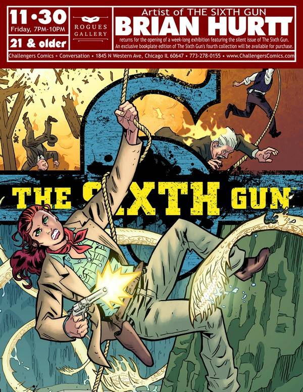 The first day of a two-day SIXTH GUN event! Brian Hurtt returns to The Rogues Gallery for a special one-week art exhibition! To celebrate the release of the fourth collection of the award-nominated series The Sixth Gun, “A Town Called Penance”, Brian will be displaying every page of art from the silent issue of The Sixth Gun, #21. Alongside writer Cullen Bunn, Brian will be meeting fans at a 21+ opening event. No books will be signed, but plenty of merchandise will be available for purchase, including an exclusive bookplate edition of “A Town Called Penance”. After the opening night, the artwork will remain on display through December 6th.