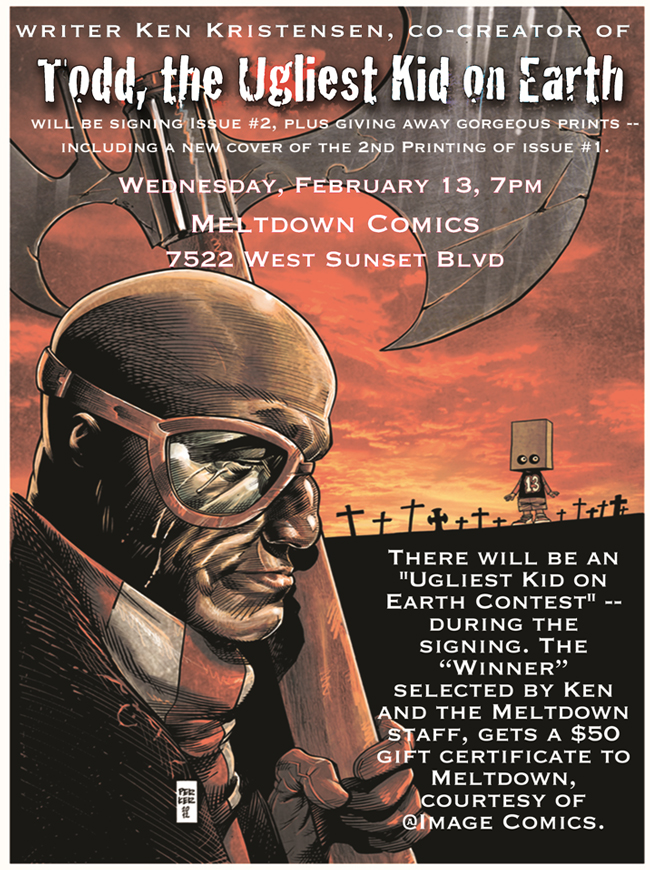 Writer Ken Kristensen signs at Meltdown Comics on Wednesday, February 13, 2013 at 7:00 pm! An “Ugliest Kid on Earth Contest” — during the hours of the signing whoever brings the ugliest kid (one “winner”, as selected by Ken and the Meltdown staff) to the store gets a $50 gift certificate to Meltdown, courtesy of Image Comics.