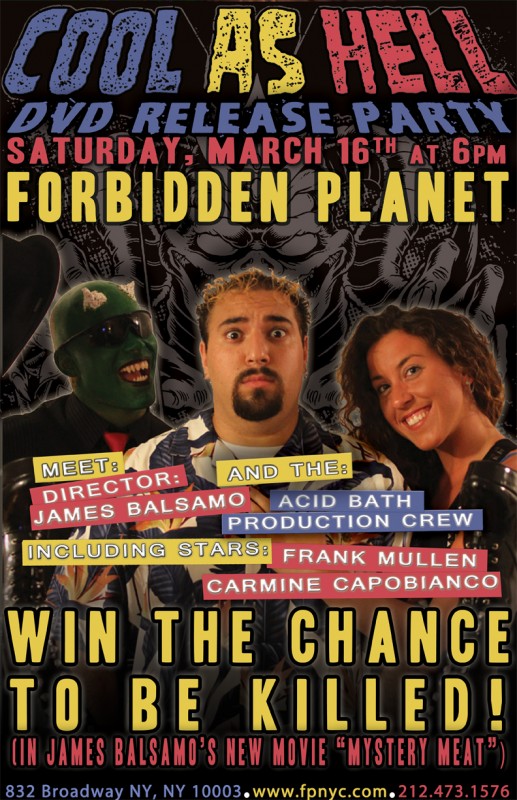 On Saturday March 16th at 6pm Forbidden Planet throws a DVD launch party for James Balsamo’s new horror movie COOL AS HELL. Director James Balsamo (Hack Job, I Spill You Guts)and the Acid Bath Production Crew will be in store for signings, as well as the other stars of the film Carmine Capobianco (I Spill Your Guts, Psychos In Love) and Frank Mullen (I Spill Your Guts, Singer of Suffocation)! And if that wasn’t enough for you greedy horror movie fanatics there is going to be a contest to get KILLED (in James’s new movie “Mystery Meat”). Don’t miss the chance to be caught on celluloid in all the glory gore.