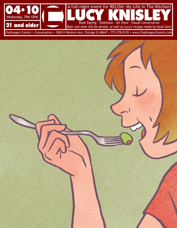Cartoonist Lucy Knisley is coming to Challengers on Wednesday April 10th at 7:00 pm for a party! She’ll be signing copies of her terrific new book Relish: My Life In The Kitchen, hosting a slideshow, and hanging out with fans in a gallery decked out with her artwork. Beer and wine will be served, as well as Lucy’s recipes from Relish prepared by local fans. It’s going to be fun (potentially) on a bun!