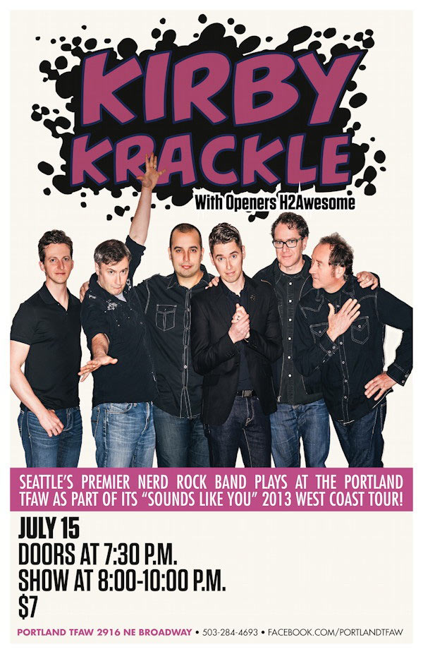 Kirby Krackle, Seattle’s hottest nerd rock band, plays at the Portland Things From Another World on Monday July 15th with openers H2Awesome as part of their “Sounds Like You” 2013 West Coast Tour! Come to the Portland TFAW at 2916 NE Broadway: the cover is $7, doors open at 7:30, and the show is from 8:00-10:00 p.m.