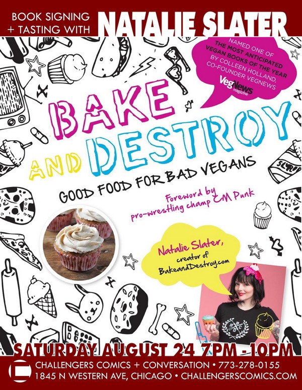 BAKE AND DESTROY: Good Food for Bad Vegans. Challengers is proud to be host for NATALIE SLATER’s BAKE AND DESTROY RELEASE PARTY! Not only will NATALIE be on-hand to sign your book, but a host of fans will be making some of her recipes, so come hungry! This will be a party like none other we’ve thrown.