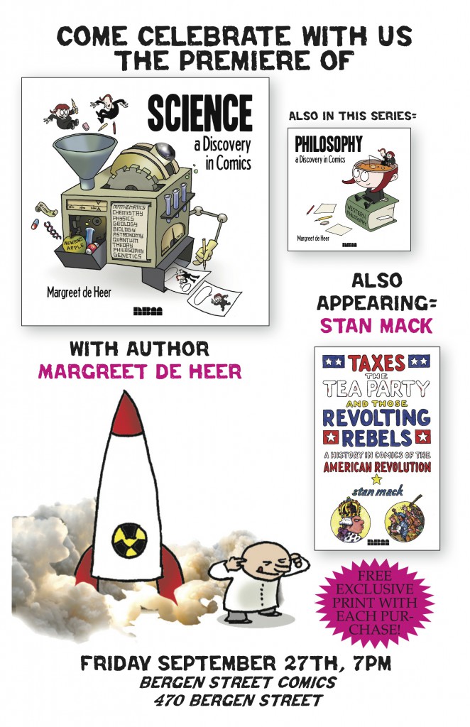 Bergen Street Comics closes out a September full of book release parties on Friday the 27th, at 7pm, with an appearance by acclaimed graphic novelists Margreet De Heer and Stan Mack! It’ll be an evening of fun, with De Heer signing her new release Science: A Discovery in Comics, plus the previous release in the series, Philosophy: A Discovery in Comics, and Mack pitching in with his fantastic historical work Taxes, the Tea Party, and those Revolting Rebels: A History in Comics of the American Revolution. Come have a drink on us and pick up some great books while you’re at it!