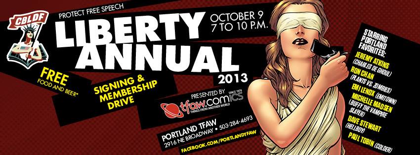 The Comic Book Legal Defense Fund has fought for the First Amendment Rights of the comics community since 1986. Now here’s your chance to join the fight for free speech at our CBLDF Liberty Annual 2013 signing and membership drive October 9 at the Portland TFAW.