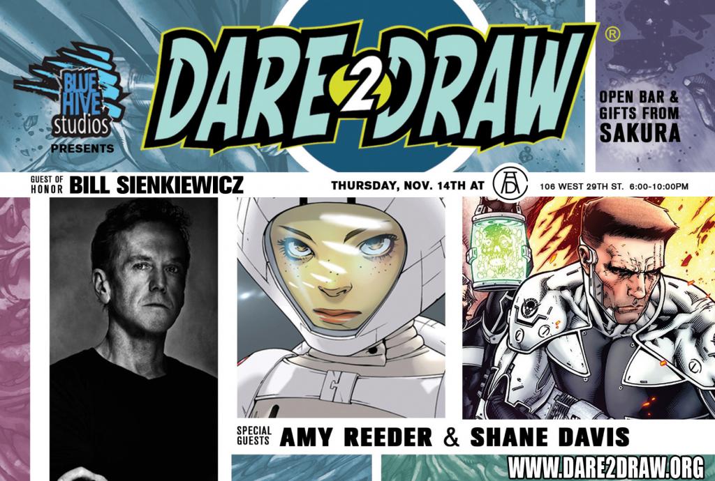 Bill Sienkiewicz, Amy Reeder, and Shane Davis appear at Dare2Draw’s final event for 2013 on Thursday November 14th from 6:00 to 10:00 PM. Hosted by Liza Biggers and Simon Fraser!