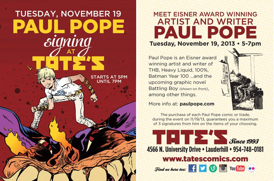 Comic creator Paul Pope appears at Tate’s Comics on Tuesday, November 19, 2013 from 5:00 until 7:00pm!