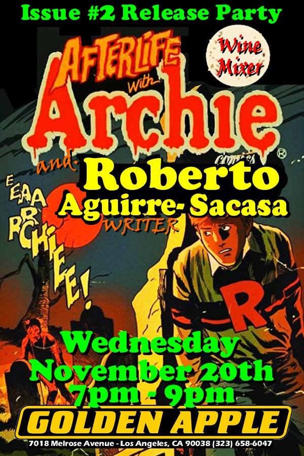 You are invited to a FREE PARTY at Golden Apple Comics to celebrate the release of Issue #2 of AFTERLIFE WITH ARCHIE…One of the biggest hits of the year. The first issue sold out nationwide and we have the WRITER: ROBERTO AGUIRRE-SACASA joining us on the day of release WEDNESDAY NOVEMBER 20TH from 7-9pm.