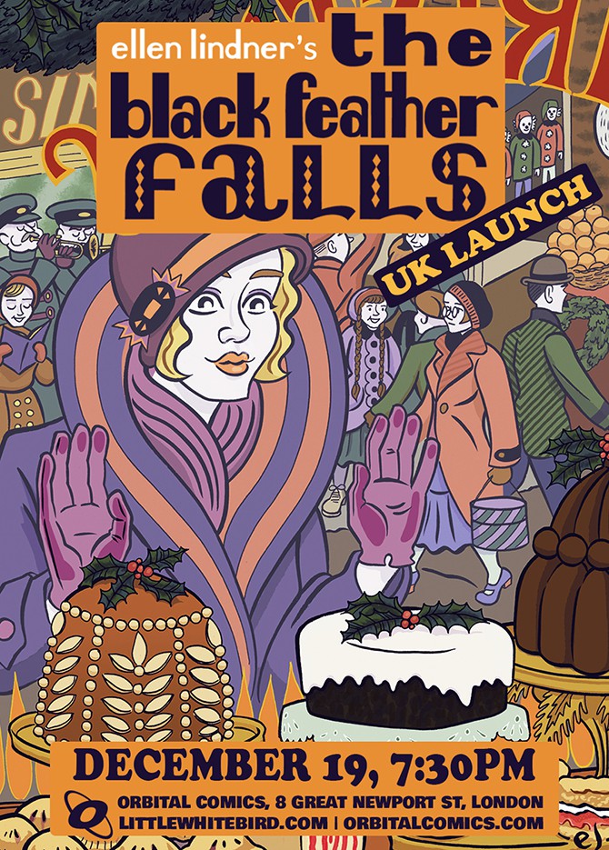Join Ellen Lindner and the fine folks of Soaring Penguin Press at Orbital Comics on Thursday December 19th at 7:30 pm to celebrate the launch of her brand-new four-part murder mystery mini-series The Black Feather Falls.