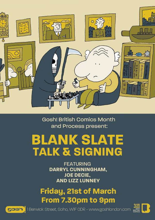 Our Steven runs a monthly night called Process, where working and aspiring comics artists and writers get together and (you’ve probably guessed it by now) talk about their work process. As part of British Comics Month, March will see a Blank Slate themed affair, with Darryl Cunningham (Science Tales, Uncle Bob Adventures), Joe Decie (The Accidental Salad) and Lizz Lunney (Take Away), all talking about their own comics-making methods, chaired by Woodrow Phoenix. Creators will also be available to sign books after the talk!