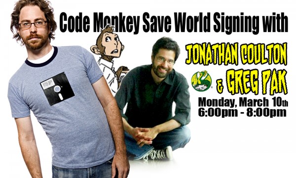 Jonathan Coulton and Greg Pak appear at Dragon’s Lair in Austin to sign Code Monkey Save World on Monday, March 10th from 6:00 pm till 8:00 pm!