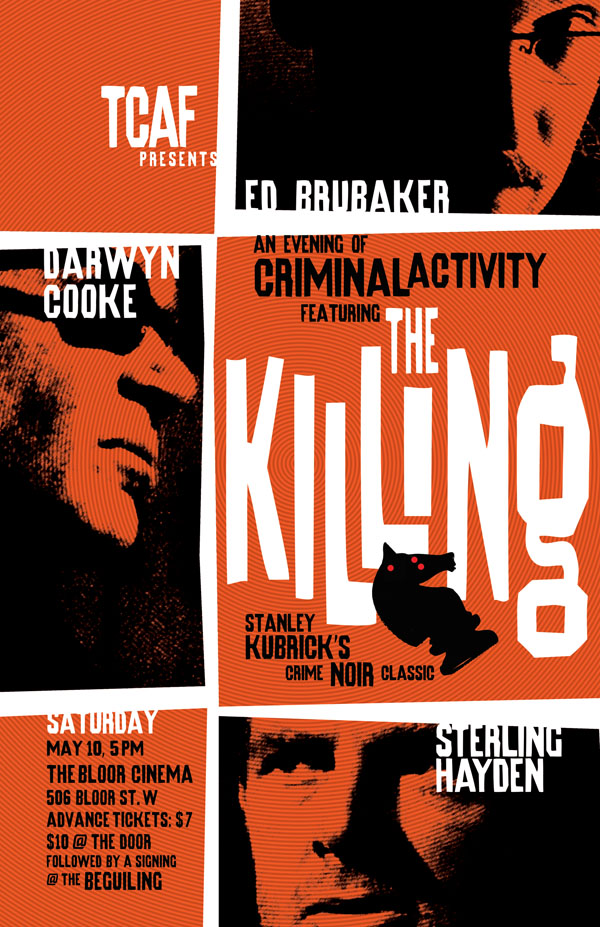 Join two of comics’ greatest crime noir authors and Featured Guests of the Toronto Comic Arts Festival, Ed Brubaker (Criminal, Fatale) and Darwyn Cooke (Parker, Selina’s Big Score), in a special evening of comics and noir! The two will discuss their work and influences with special guest interviewer Cameron Ashley (Crime Factor), and they’ll cover their love of all things down, dirty, and mean. Cooke and Brubaker will then introduce a special screening of one of their favourite crime films, Stanley Kubrick’s The Killing. Tickets are $7 in advance, $10 at the door, and are available now online at the link…